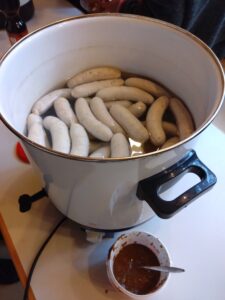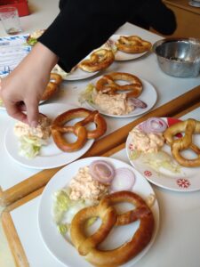 Für das leibliche Wohl war ebenfalls gesorgt. Es gab frische Brezen und Semmeln, dazu Weißwürste und Wiener. Als besonderes Highlight boten wir sogar selbst gebrannte Mandeln an. Schon im Vorfeld hatten wir das Oktoberfest mit auffälligen Plakaten im ganzen Schulhaus beworben. Zu Beginn hielten wir eine kleine Eröffnungsrede und begrüßten alle Besucher herzlich.